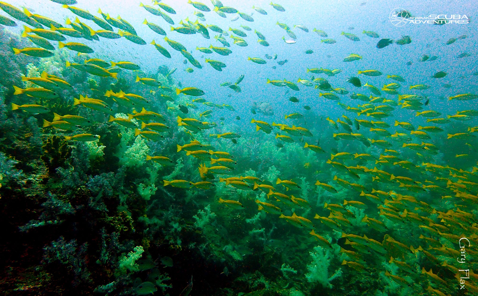 Dive Three: ‘Richelieu Rock’. The final part of this dive site; the central point. The only way I can describe this is either “A highway to fish” or “Its raining Fusiliers!” Everywhere above, below and along side us were big schools of fish. It was absolutely breath taking. Amongst the smaller schools, there were many Great Barracudas, Yellowtail Barracudas and Pickhandle Barracudas, all playing in the current staring us out. The coral was very pretty and covered most of the site. After three dives here, it becomes quite clear that not only is it a beautiful place, it is also deadly with the amount of Scorpion/Stone fish and the Decorator Urchins.