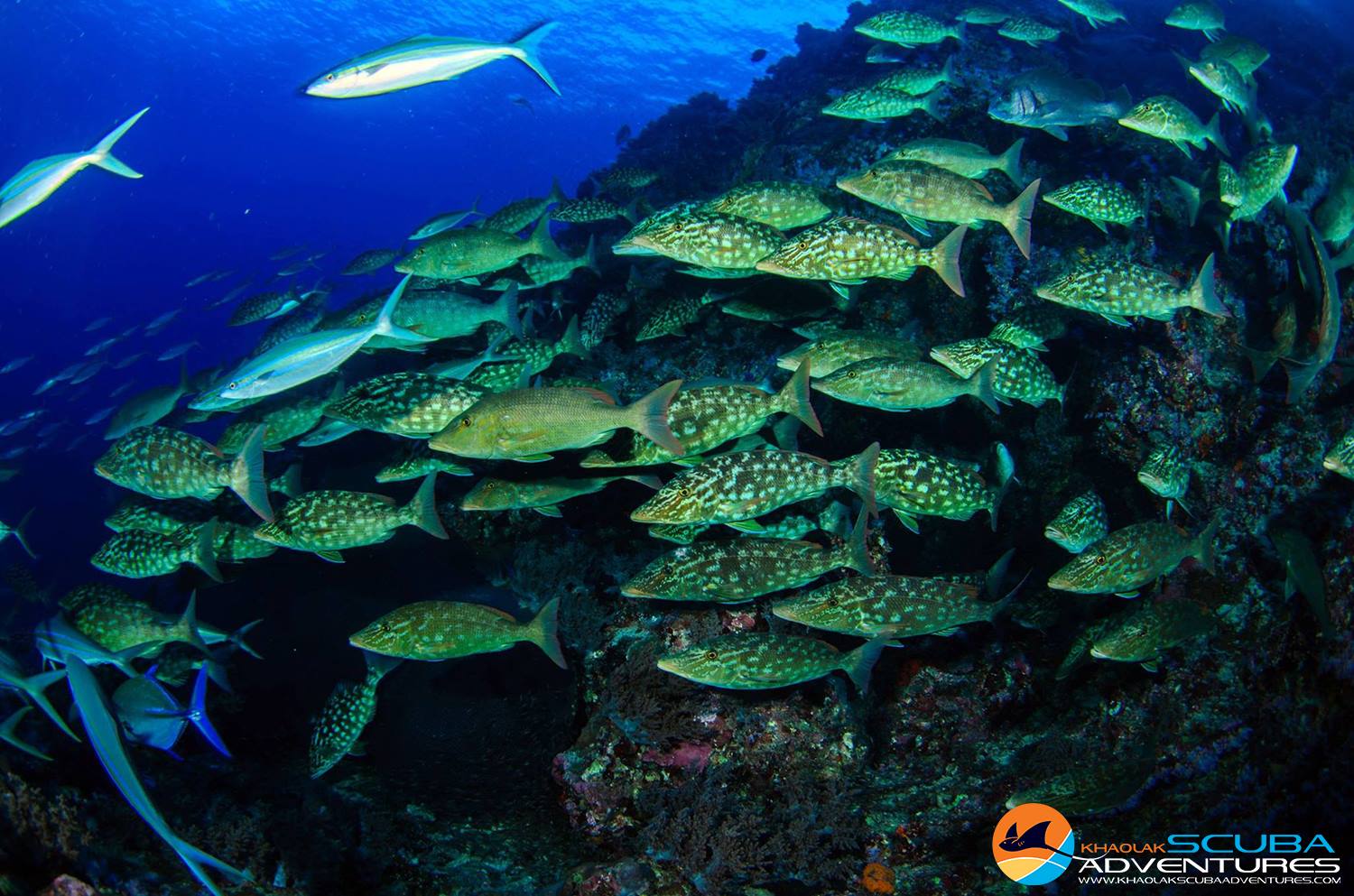 Koh Tachai Island living up to its usual reputation for strong current attracting large amounts of barracudas, trevallies and rainbow runners.