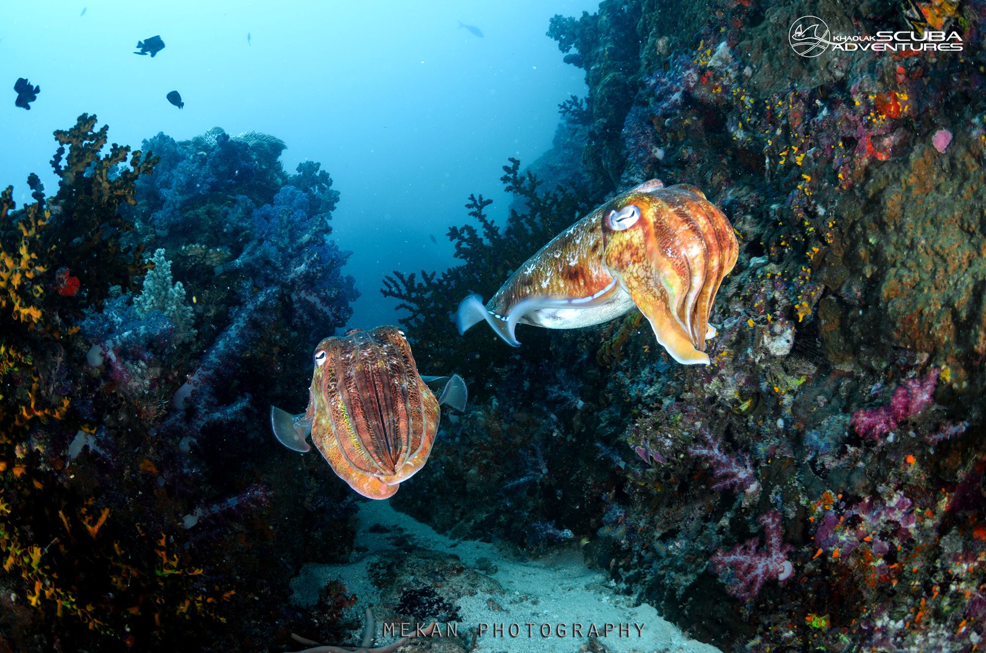 Richelieu Rock Part One and Part Two. The visibility here was really bad. Pushing 5 meters. It was a shame as the site is one of the best. We didn’t let that spoil our fun though, it just meant we had to get in closer to the corals and rocks. Even with the bad visibility we saw so much life here on both dives. We saw more schooling Barracuda, schooling Rabbit Fish, Great Barracuda, a very dosile Hawksbill Turtle, and even 3 Cuttlefish (2 males trying it on with one female). We were meant to be doing third dive here but as the visibility was quite bad, we decided to go back to Koh Tachai. Koh Tachai once again did not disappoint. We had so many free swimming Moray Eels, a very happy looking Black spotted Pufferfish and even some Octopus. We had quite a lot of current at this site but it was a lot of fun playing in it.